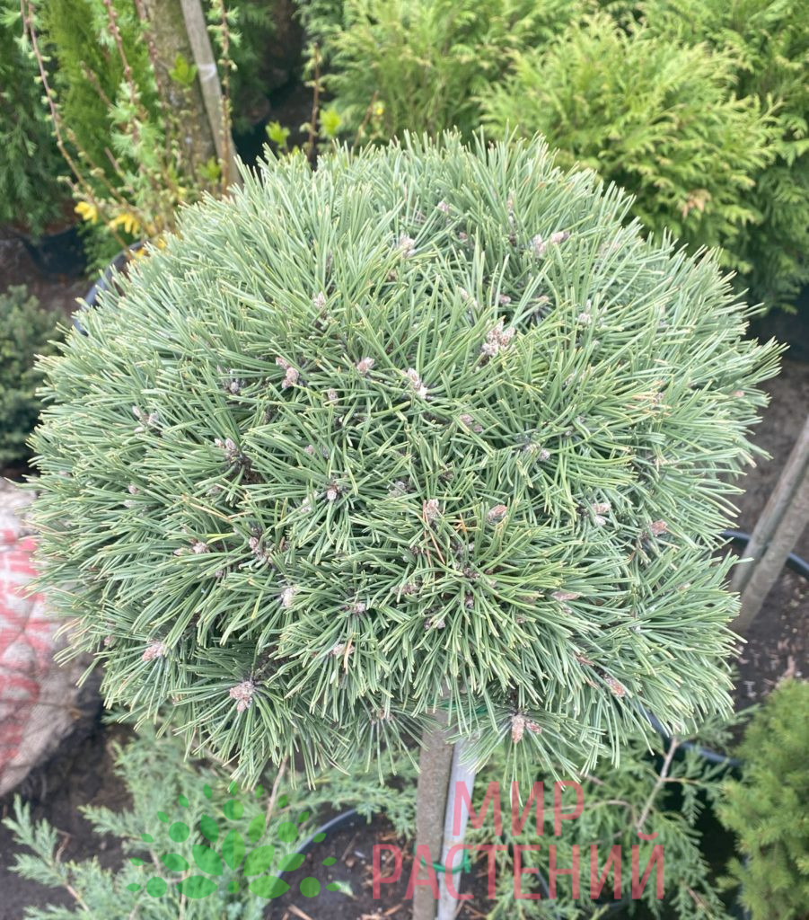 Внешний вид: Растение формирует идеально симметричную шаровидную крону с очень густо расположенными короткими побегами. Хвоя ярко-зеленая, короткая, жесткая, собрана в характерные для горных сосен пучки по две хвоинки. Крона настолько плотная, что сквозь нее практически не видно внутренних ветвей. Растет очень медленно, годовой прирост составляет всего 2-3 см.
