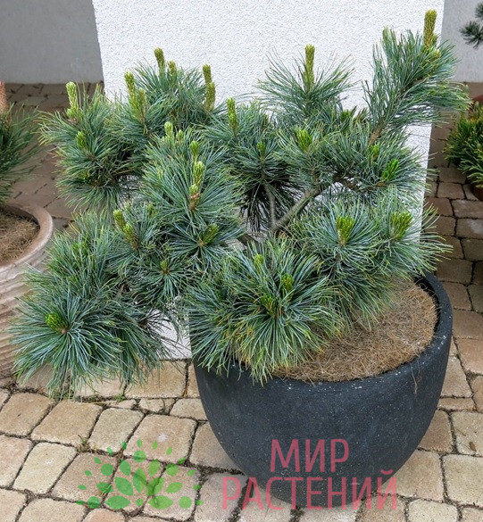 Внешний вид: Растение формирует плотную симметричную крону шаровидной формы. Хвоя длинная, мягкая, собрана в пучки по пять хвоинок, окрашена в привлекательный голубовато-зеленый цвет с серебристым оттенком. Молодые приросты имеют более светлый голубоватый цвет, создавая красивый контраст со старой хвоей. Растет очень медленно, годовой прирост составляет всего 3-5 см.