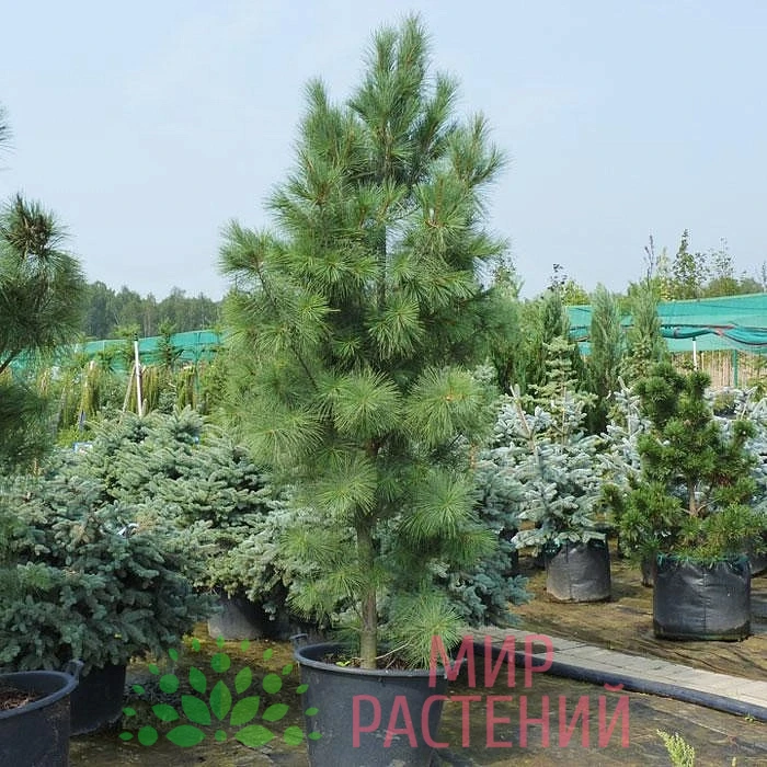 Внешний вид: Дерево формирует узкую, плотную колонновидную крону с вертикально растущими основными ветвями и короткими боковыми побегами. Хвоя длинная, мягкая, тонкая, собрана в пучки по пять хвоинок, окрашена в красивый голубовато-зеленый цвет. Растет умеренно быстро, сохраняя стройную форму без дополнительной формировки.