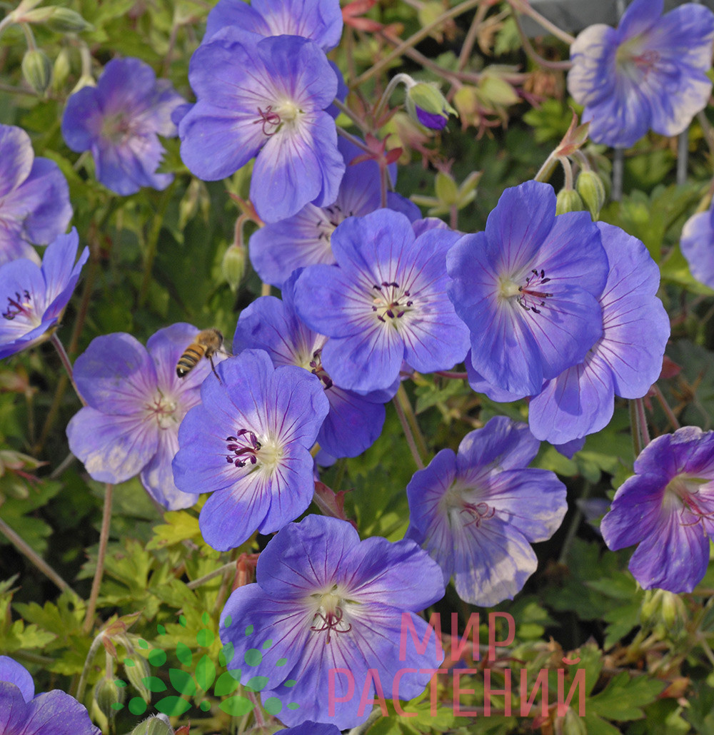 Герань ‘Rozanne’ — многолетнее травянистое растение, образующее пышный куст высотой 40-50 см и диаметром до 1 м. Отличается исключительно длительным периодом цветения — с июня до первых заморозков. Крупные фиолетово-синие цветки диаметром 4-5 см с белым центром и легкими фиолетовыми прожинками покрывают растение сплошным ковром. Декоративная резная листва с легким мраморным рисунком сохраняет привлекательность весь сезон, осенью приобретая бронзово-красные оттенки.