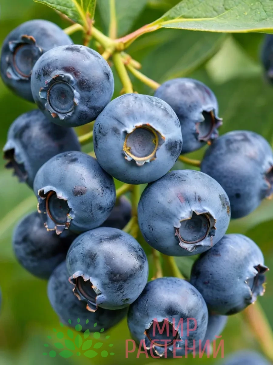Внешний вид и плоды: Куст мощный, раскидистый, высотой 1,5–1,7 метра. Плоды поражают своими размерами — это одни из самых крупных ягод голубики в мире, диаметром 20–30 мм и более, с характерной слегка приплюснутой формой. Окраска насыщенная голубая с густым светлым восковым налётом. Мякоть плотная, сочная, с гармоничным, очень сладким десертным вкусом и приятным ароматом. Созревание начинается в августе и происходит волнами вплоть до середины сентября.